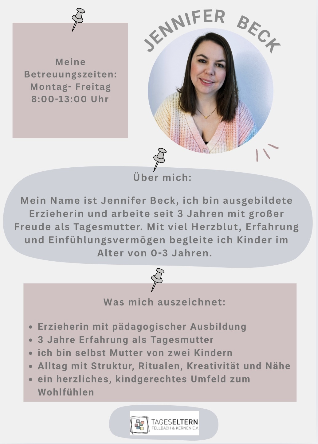Wir freuen uns Ihnen Steckbriefe einiger Kindertagespflegepersonen vorzustellen, so dass Sie einen Einblick in die Vielfältigkeit der Kindertagespflege bekommen. Viel Spaß beim Entdecken!
